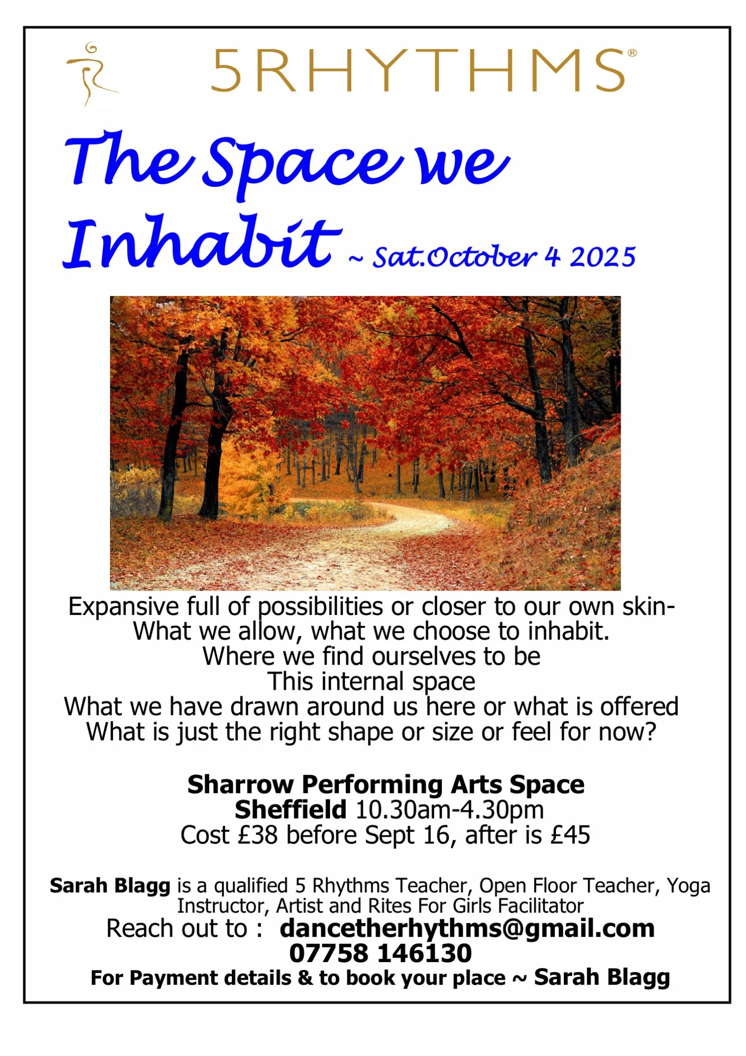 A Creative act for the dance floors to come to life, to be more of a representation of the real world. If you feel a concessionary place would allow you to dance when you wouldn’t be able to otherwise please be in touch. First check with your heart and belly, what is the amount you feel you can pay for this event/class/workshop? Email Sarah with a few words from you along with~